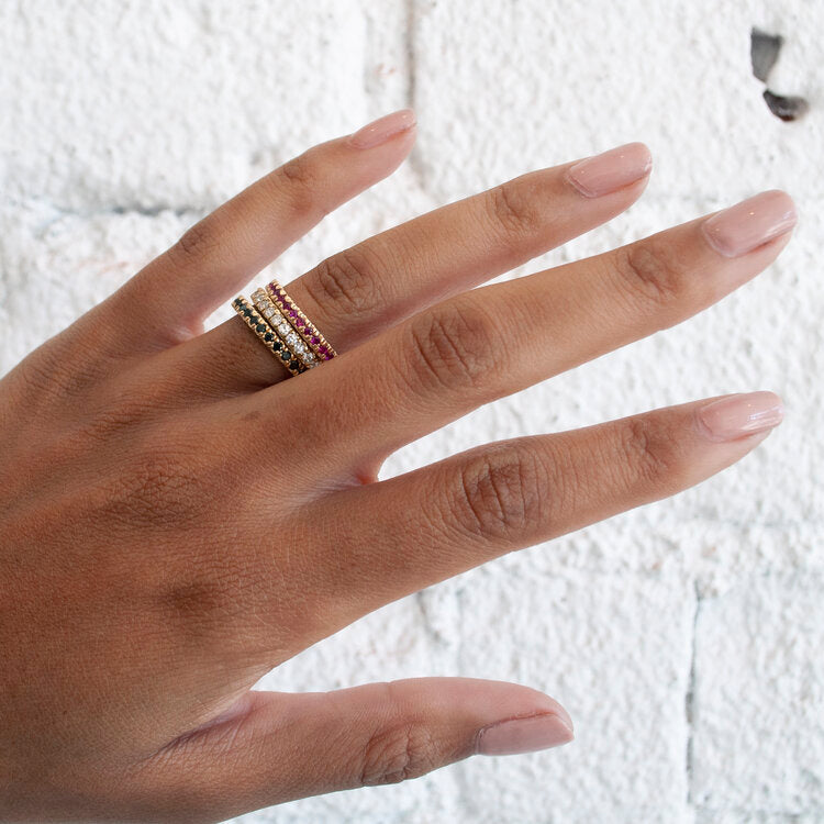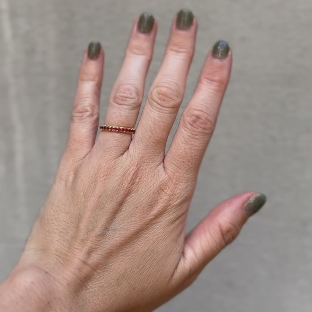 A bright and lustrous 18k gold eternity band with vibrant rubies. This Lauren Wolf Jewelry original makes the perfect stacking ring or wedding band.
