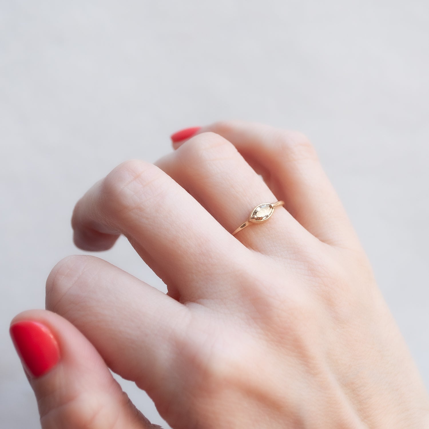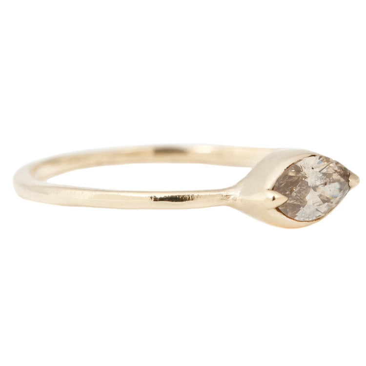 A shimmering champagne diamond gleams romantically against warm 14k gold. The marquise shape stone sits at an east-west setting for a rebellious look. Beautifully original, from Lauren Wolf Jewelry. Natural color variation in the stones makes each ring unique.