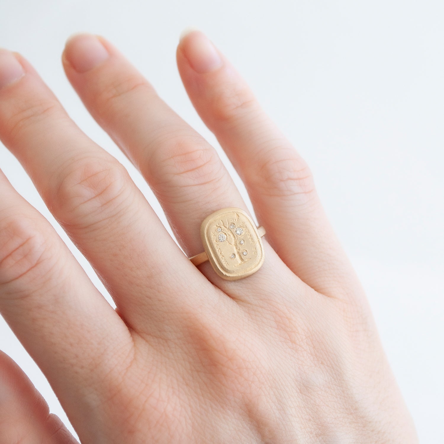 This ring is made of yellow gold and seven white diamonds. Handcrafted from the cast of an 1800's desk seal intaglio, this ring has an image of a vine wrapped around an Oak tree. The words framing this piece reads in French: “Je meurs ou je m’attache” (I die where I attach) ...in other words: Till Death do us Part.