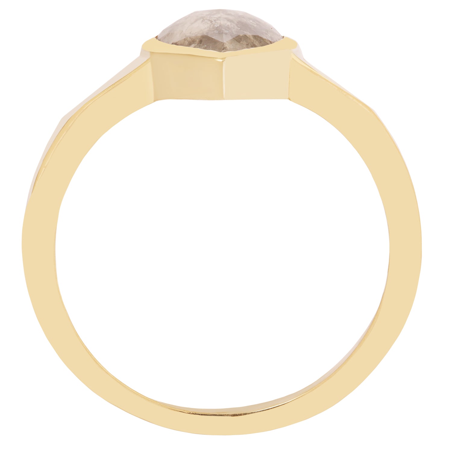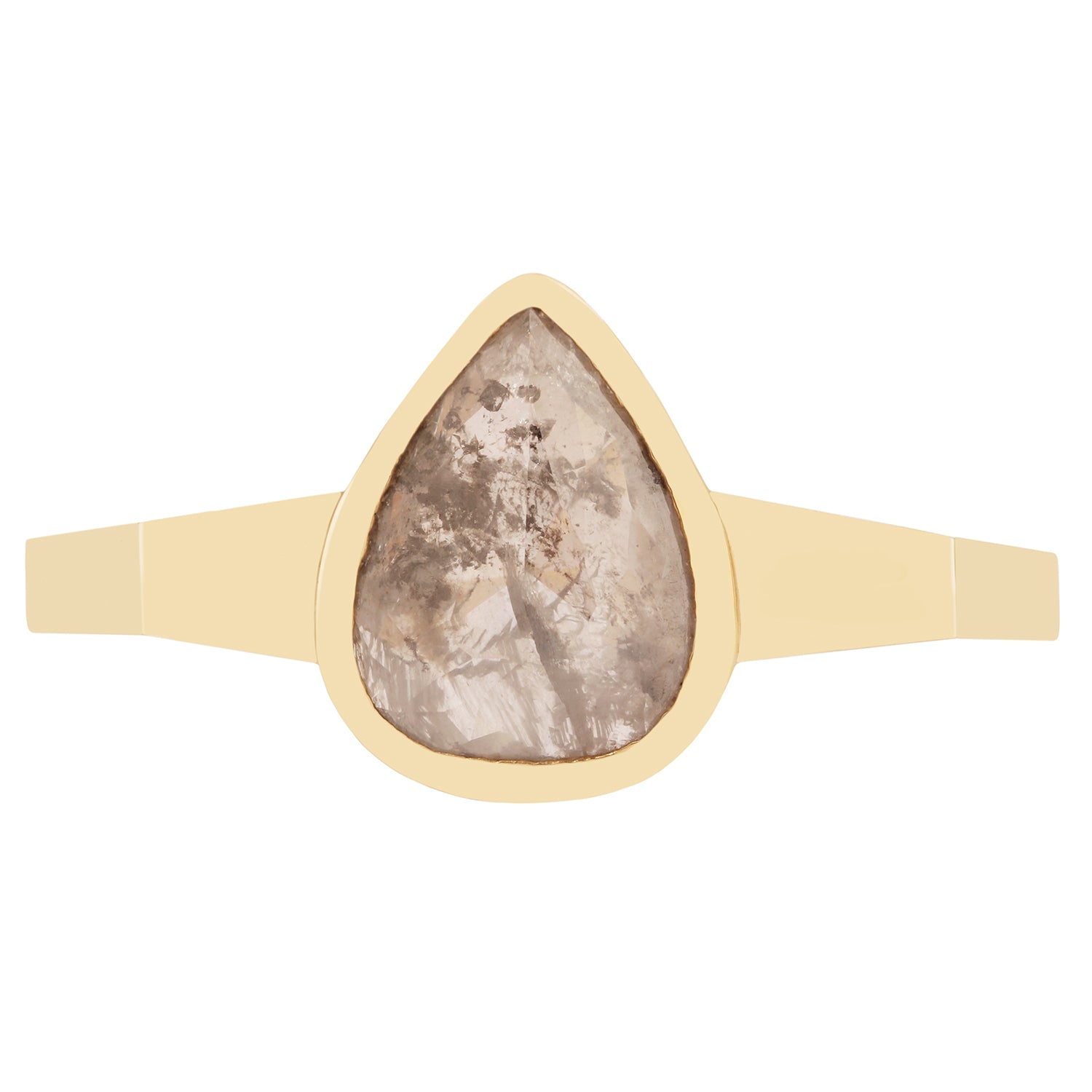 This one of a kind gray pear-shaped diamond ring from Lauren Wolf Jewelry captivates with its dark, enigmatic allure. Featuring a bezel setting and rosecut design in warm gold, this unique clear salt and pepper diamond is truly exceptional.