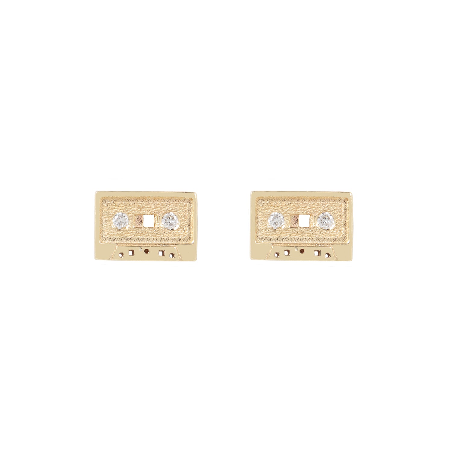 A tiny bit of musical nostalgia to adorn you, or a perfect gift for anyone with music as their love language - these tiny cassette tapes in solid 14k gold feature two flush set diamonds and holographic stippling. Kima Fine Jewelry expertly sets each stone by hand.