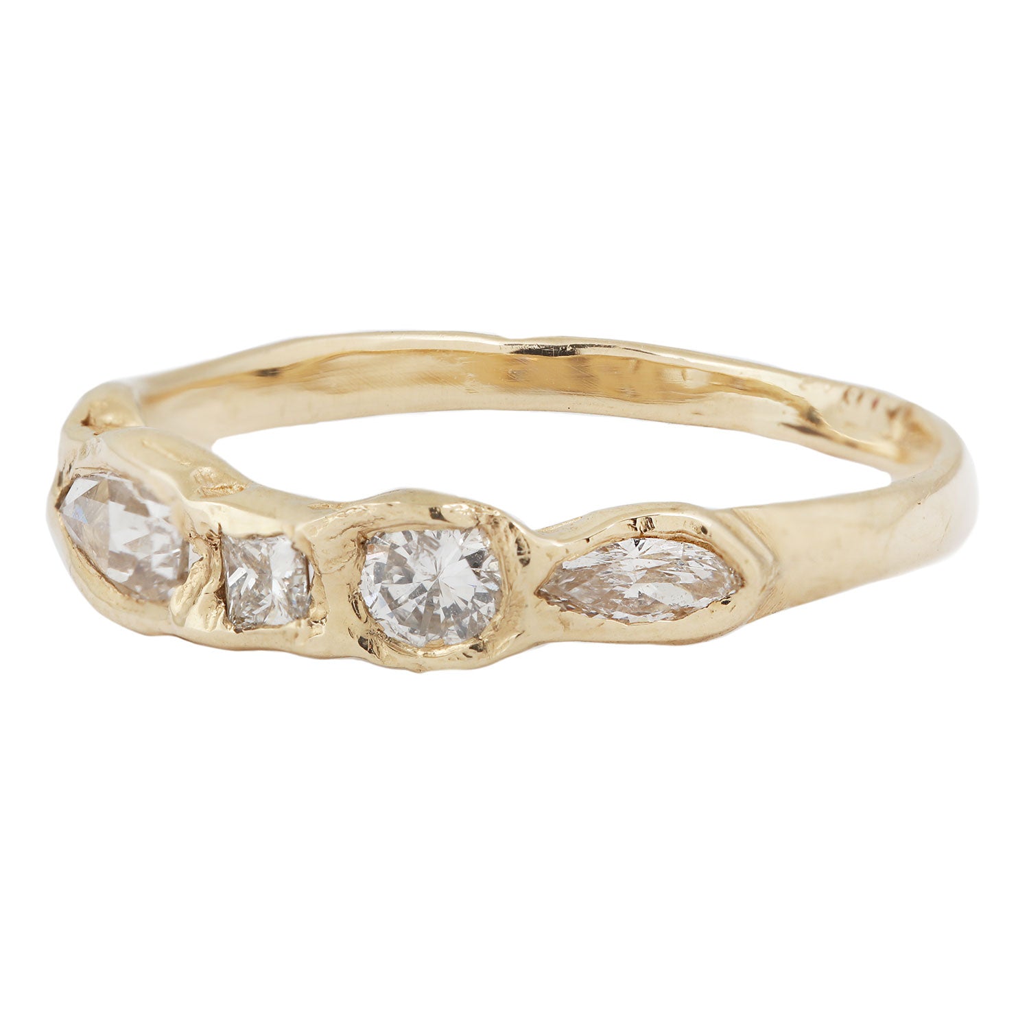 Five luminous diamonds of different shapes and cuts show off their natural brilliance. Handcrafted by Misa Jewelry, the organic band of hand-sculpted 14k gold makes the perfect backdrop for these five charming stones.