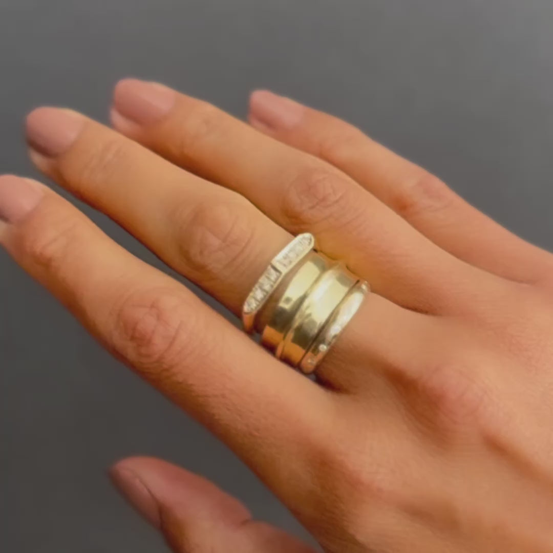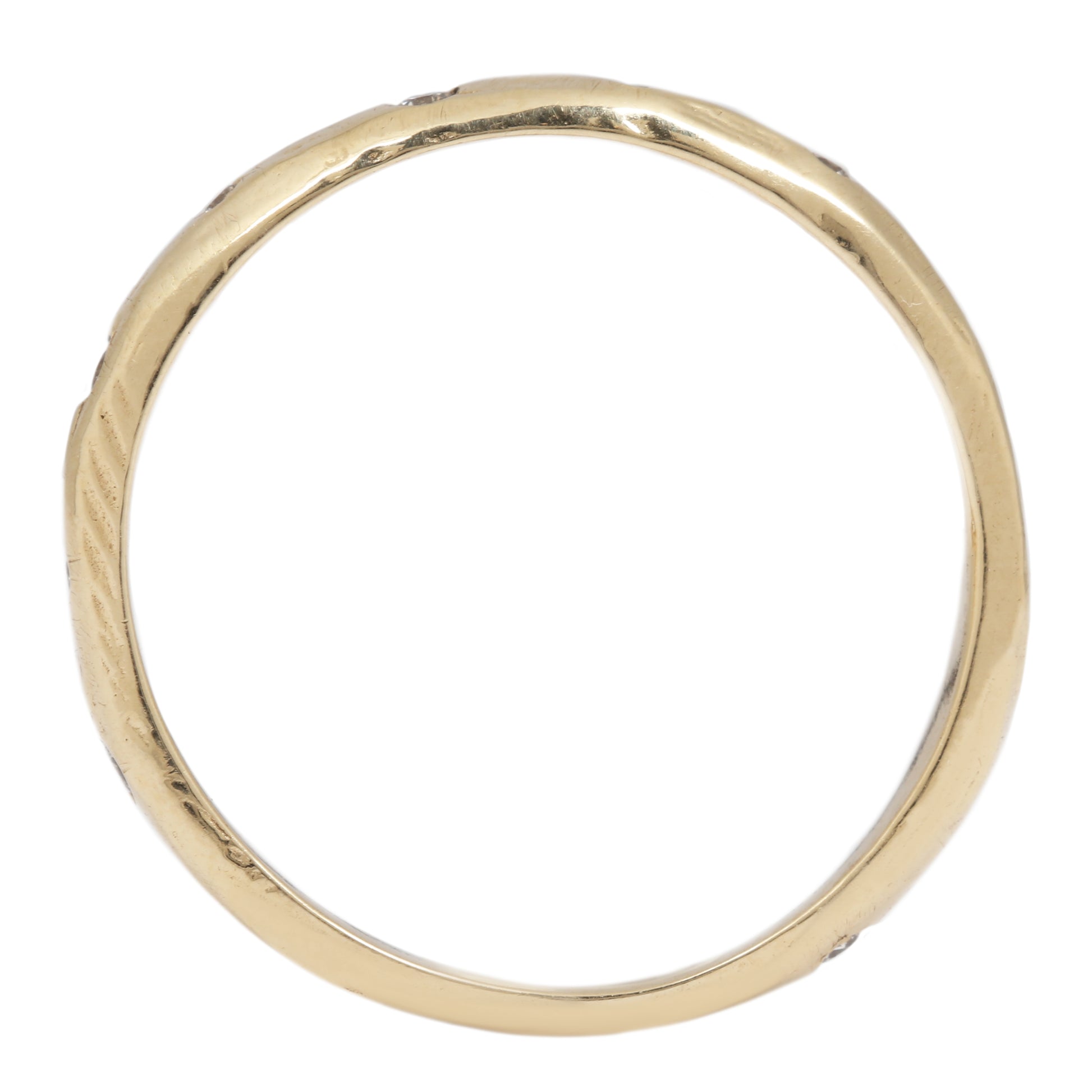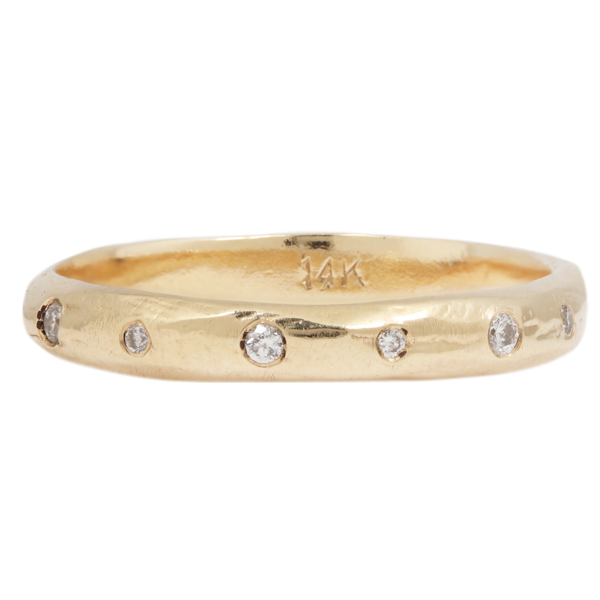Flush set white diamonds scatter around a 14k yellow gold band. This ring from ladha is beautifully hand-hewn with an organic texture and high-polish finish.