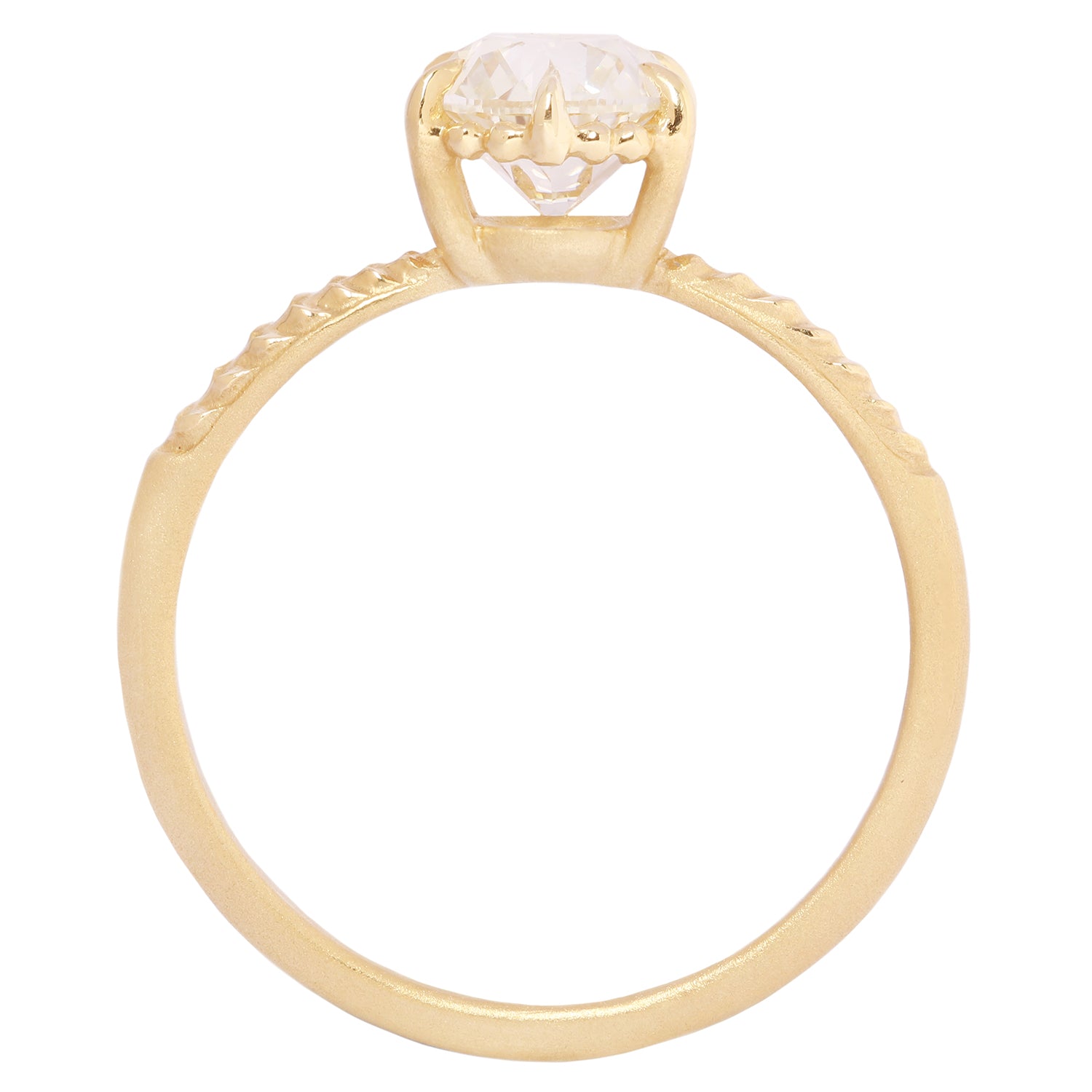 An impressive 1.01ct diamond sits clasped by claw prongs in this one of a kind ring. Megan Thorne’s signature evergreen pattern is hand-carved into the band, making this timeless ring truly unique. GIA certificate available upon request.