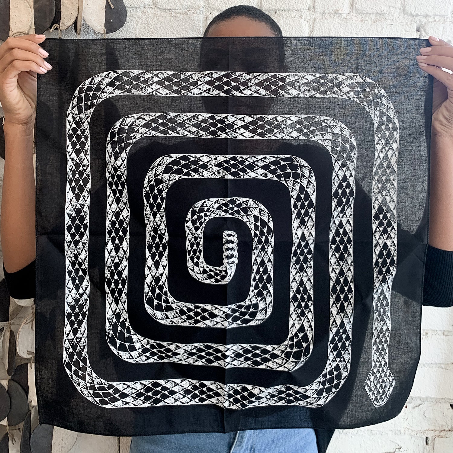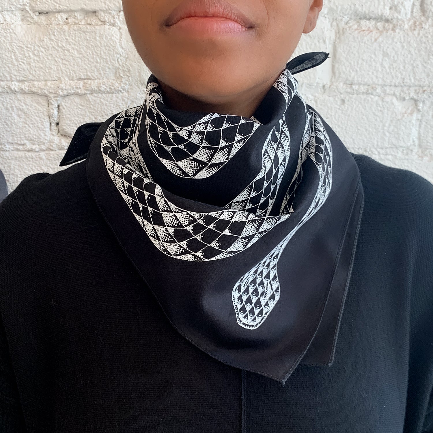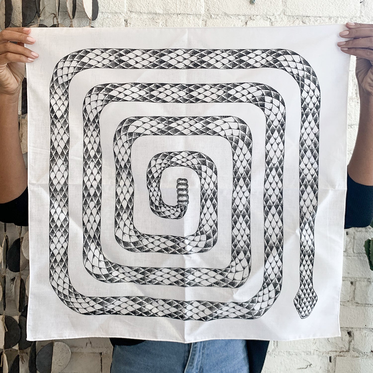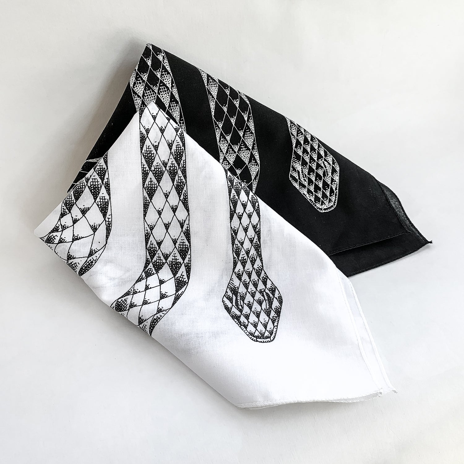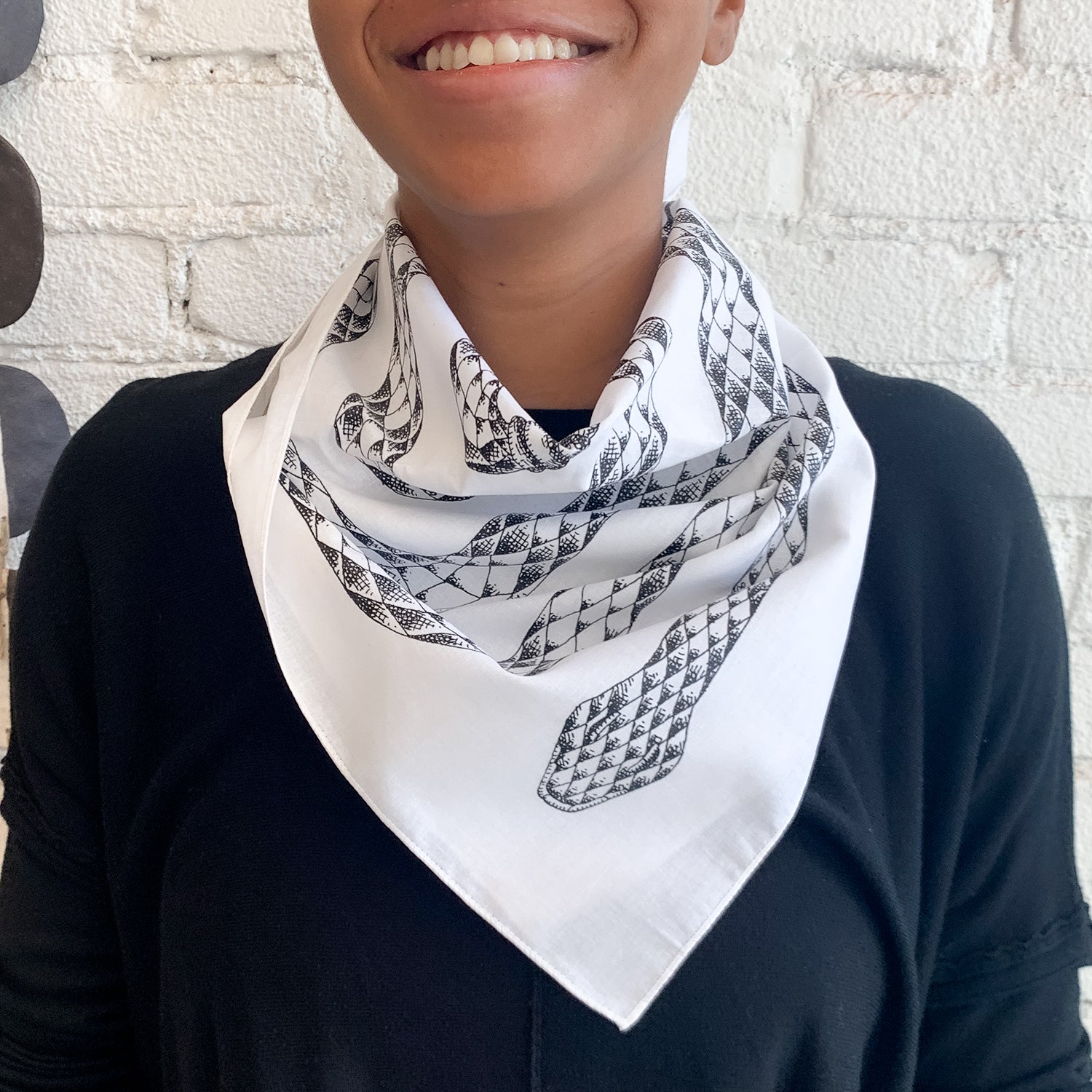Snake print cotton bandana by Oakland-based artist Patrick Dunaway. Available in white with black illustrations or black with white illustrations.