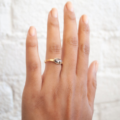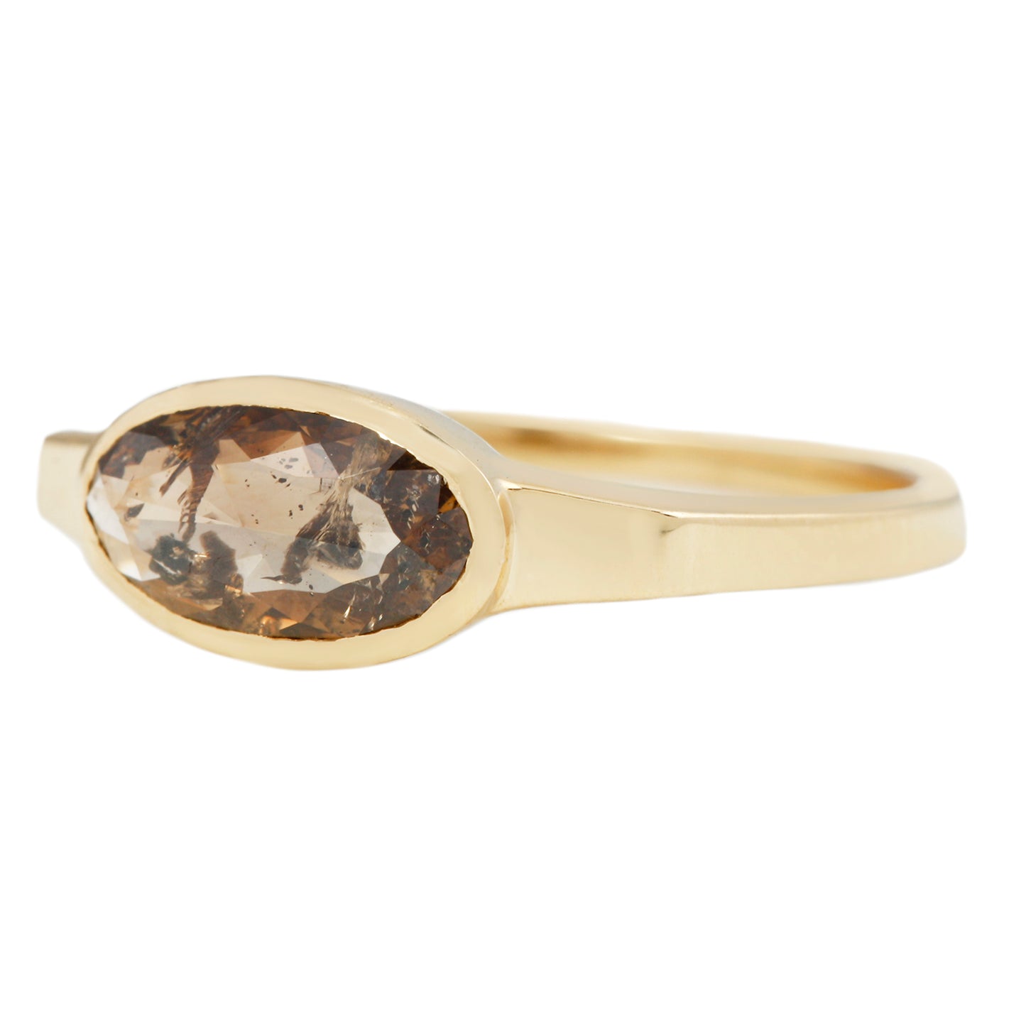 A rustic brown oval diamond mesmerizes in a smooth-lined bezel setting. High shine polished yellow gold adds to the modern look that sets a cool contrast to the romantic brown diamond. This exceptional Lauren Wolf ring is one of a kind.