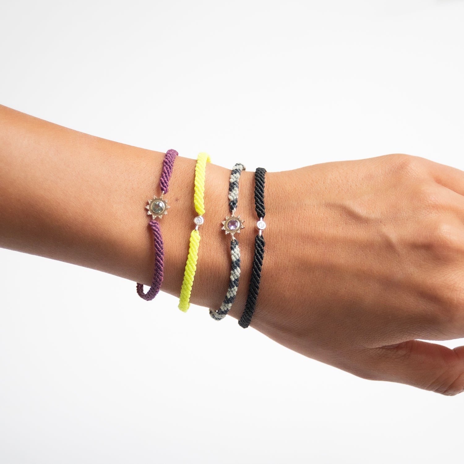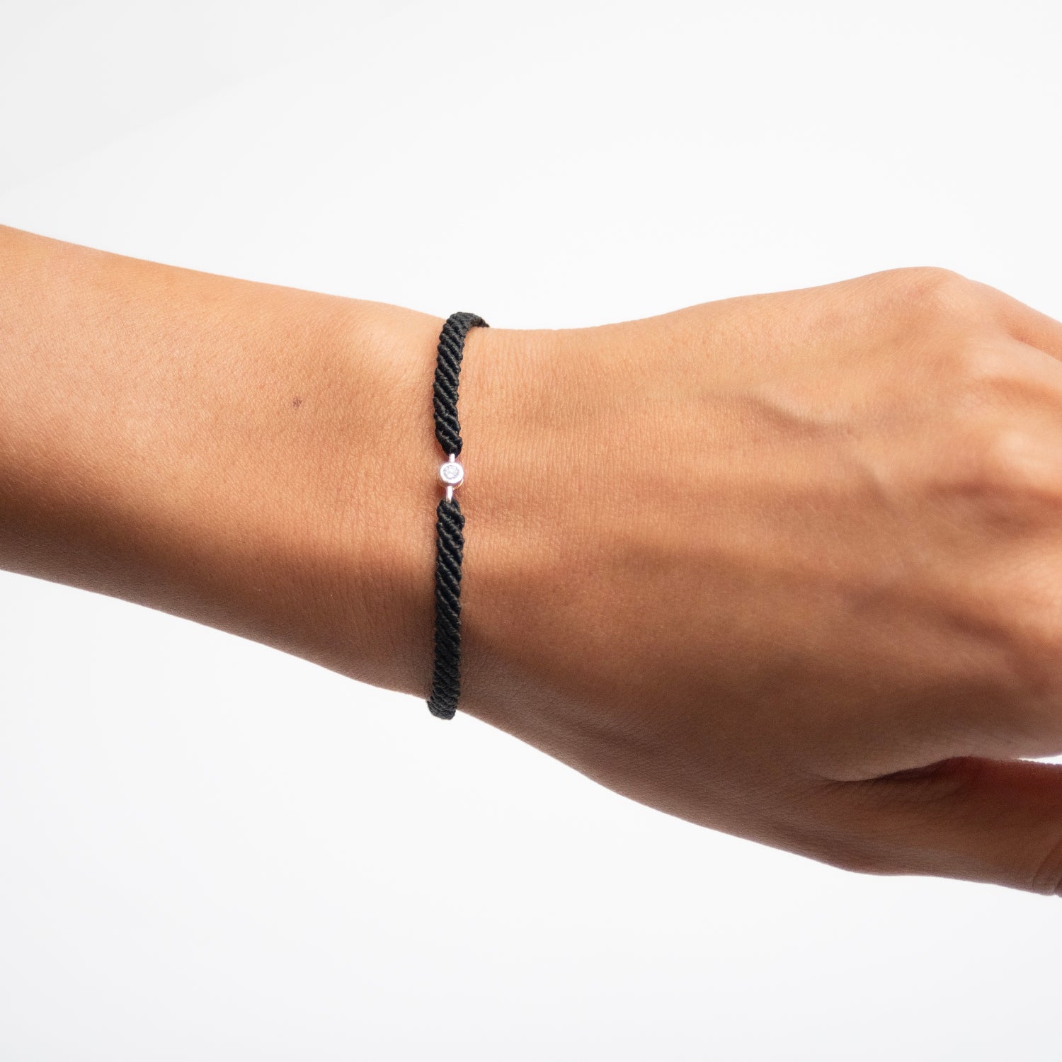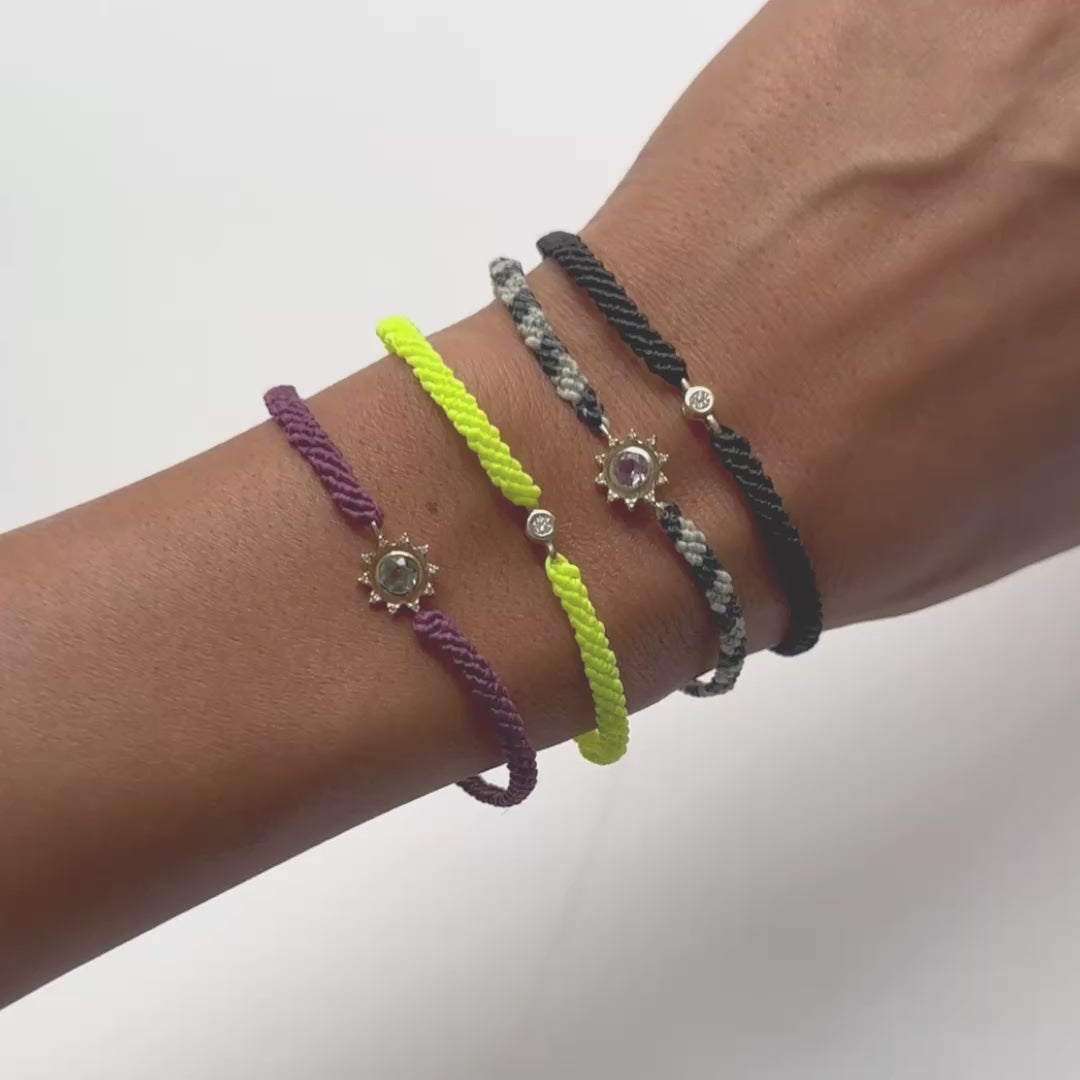 Minimalistic beauty designed to wear through sun and surf. Hand-woven into a durable braid, premium nylon cord meets precious metal and stone with a white diamond, bevel set in gold. Scosha's sophisticated take on the modern friendship bracelet.
