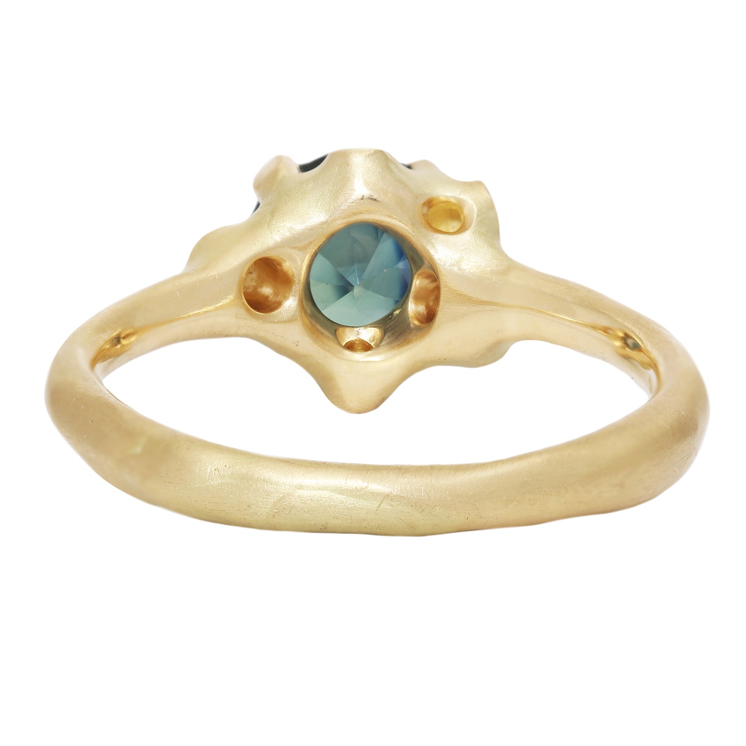 Stones: Center: 1.38ct Nigerian Natural Green-Blue Round Sapphire, Sides: Five White Diamonds (Total .13tcw)