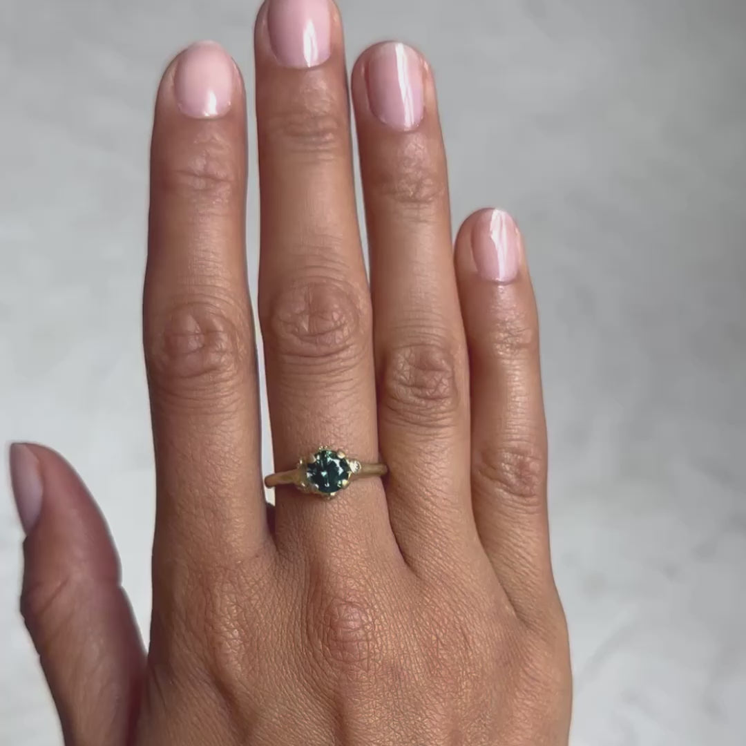 A color shifting sapphire is surrounded by white diamonds in this truly unique barnacle ring by Johnny Ninos. Featuring the natural accents and soft textures Johnny is known for, this one-of-a-kind ring brings the show-stopping splendor of nature to your finger. The natural bright green-blue sapphire stone is from Nigeria.