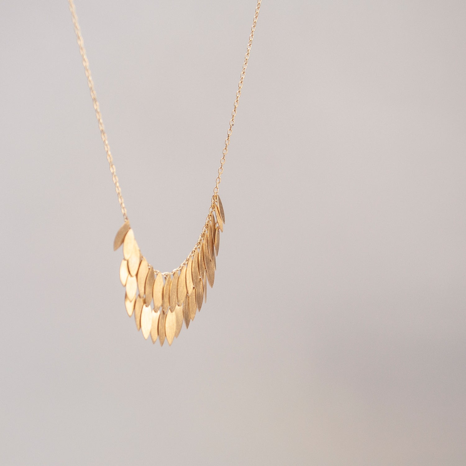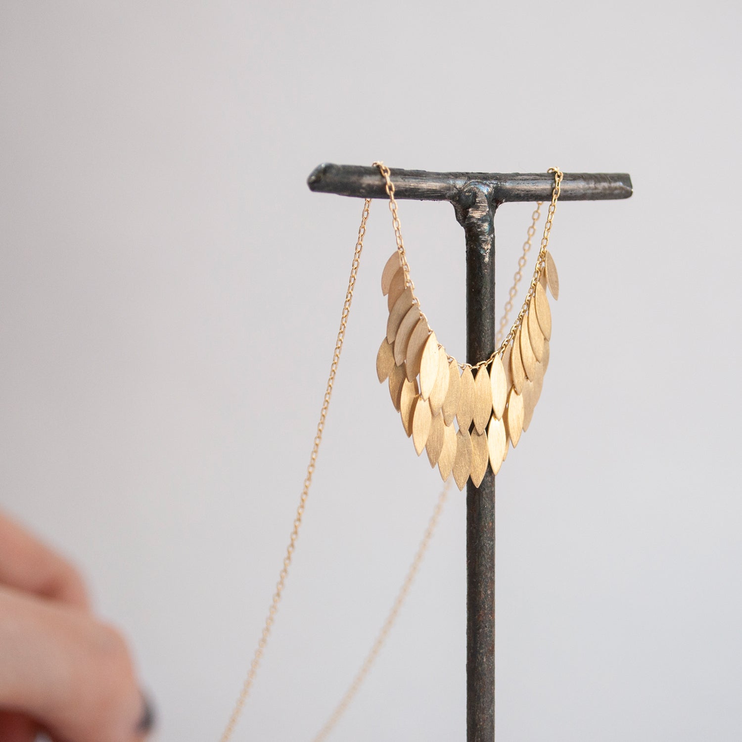 Clusters of gold leaves hang freely along a fine gold chain. Handcrafted in 18k gold with a satin finish, the leaves all move individually, adding to the ethereal quality of this Sia Taylor favorite.