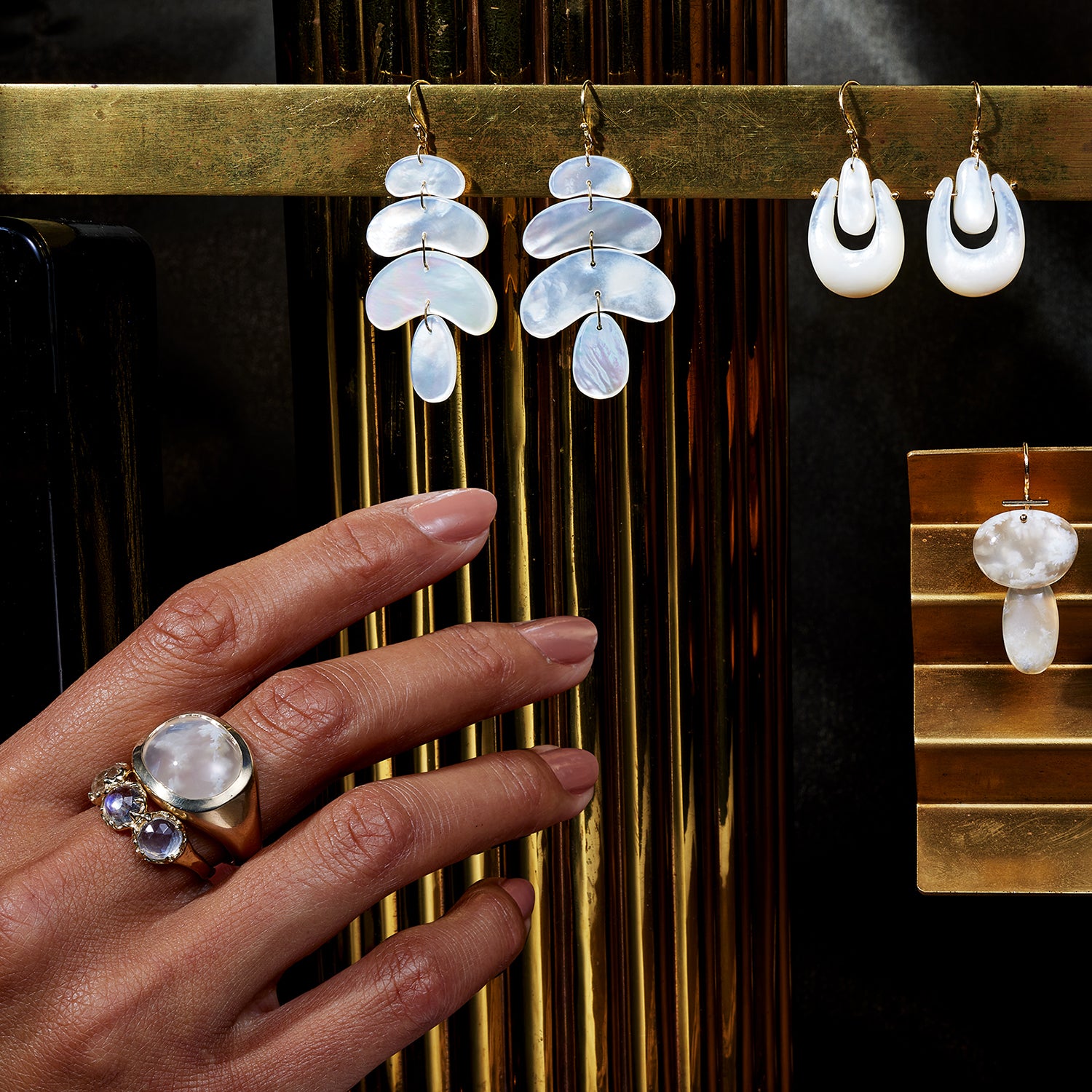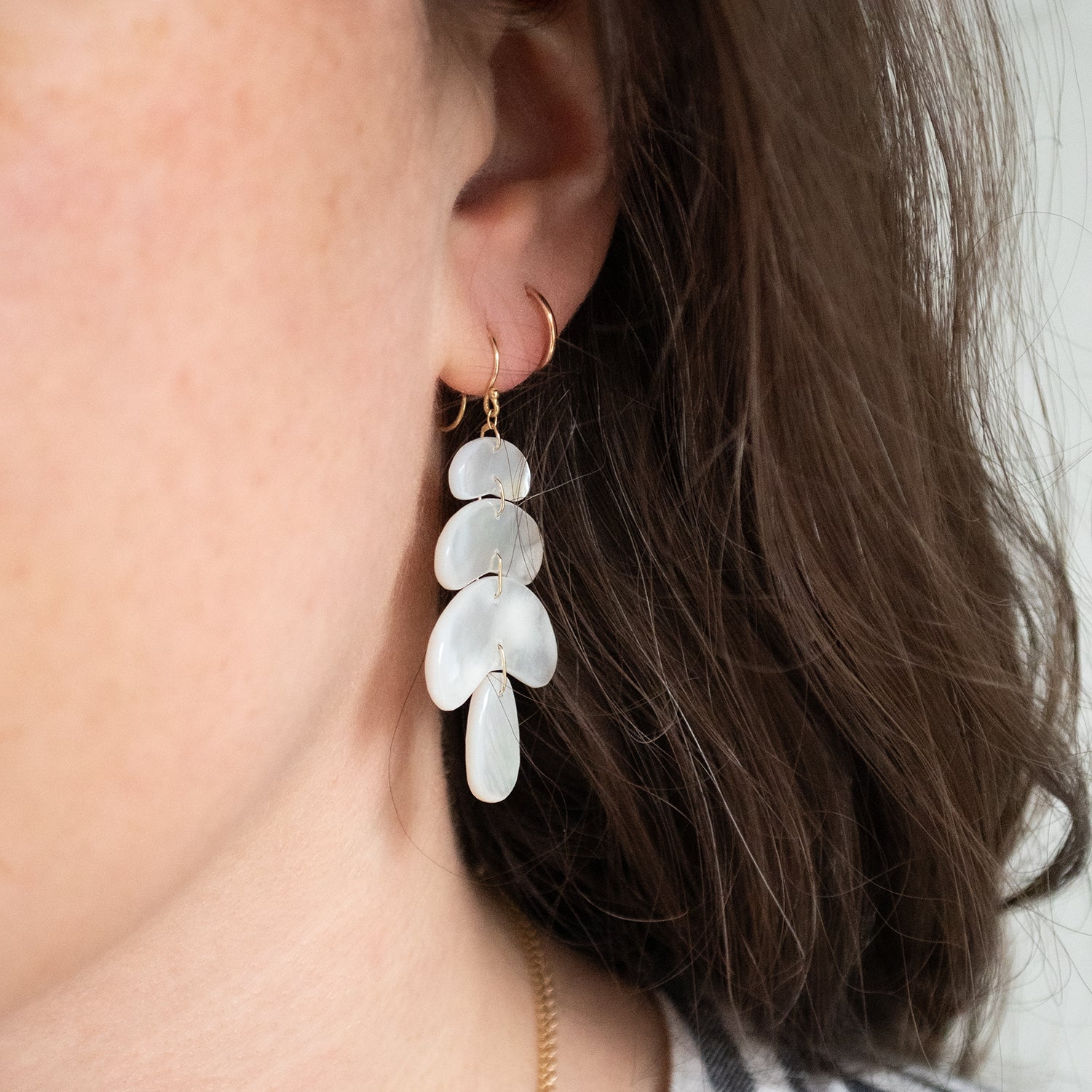 Original and show stopping mother of pearl earrings from TENTHOUSANDTHINGS. Gorgeous hand cut shapes are strung together to form a unique look that hangs delicately from solid gold. Sold as a pair.