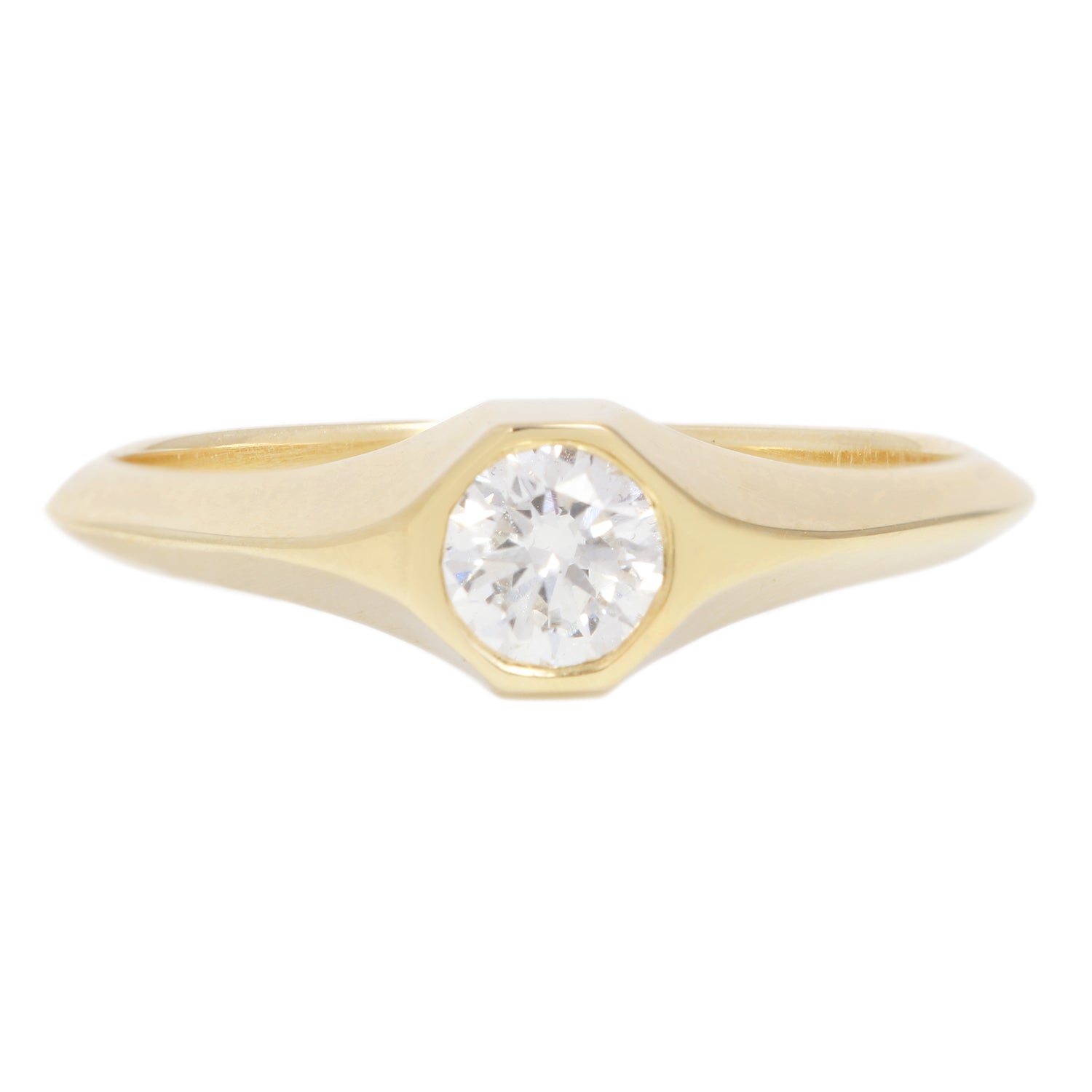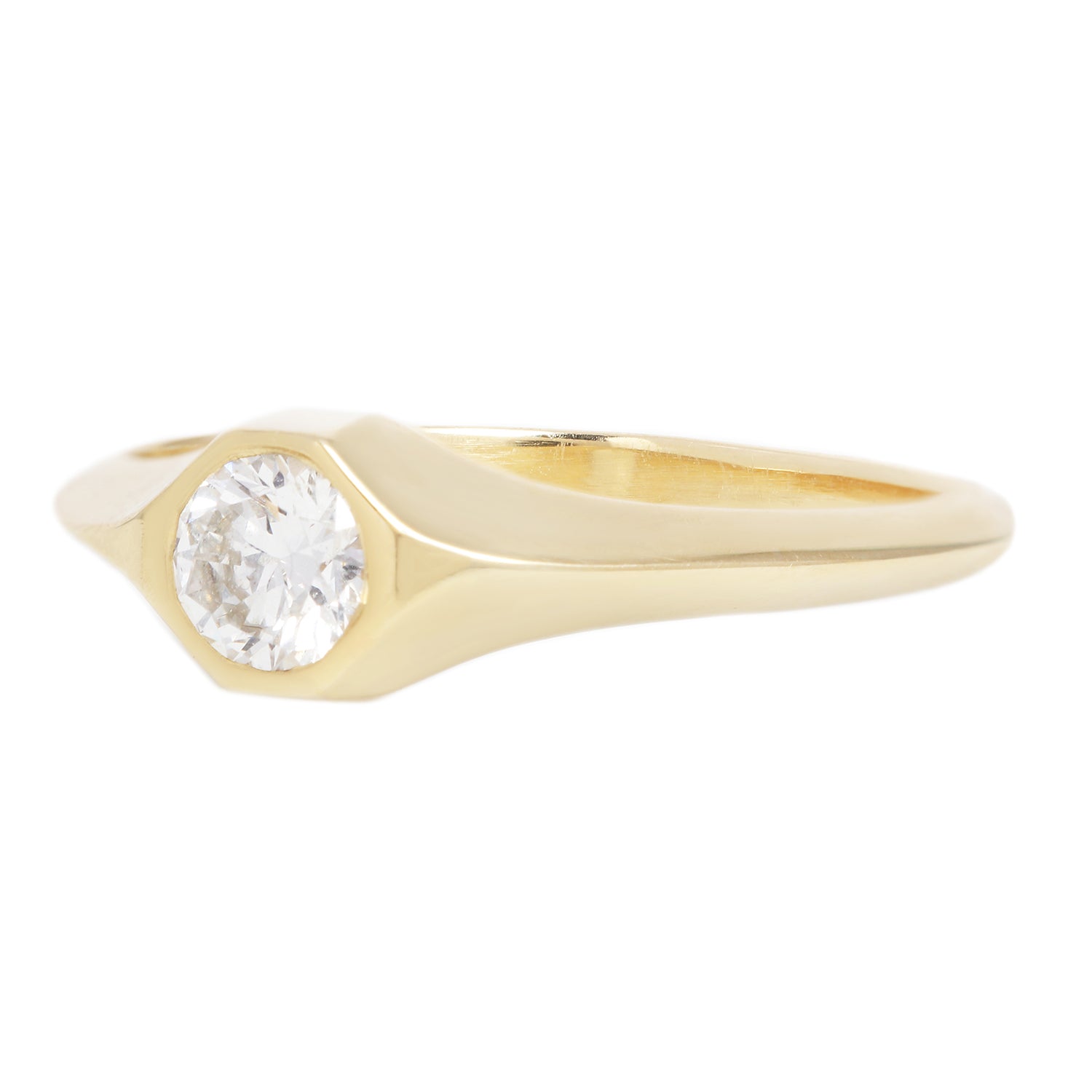 Confident and bold, this solitaire signet ring by WWAKE features a twinkling white antique old European cut diamond. High polish 14k gold frames the stone in a subtle octagonal shape. A flattened knife-edge band allows this stunning signet to stack with other rings.