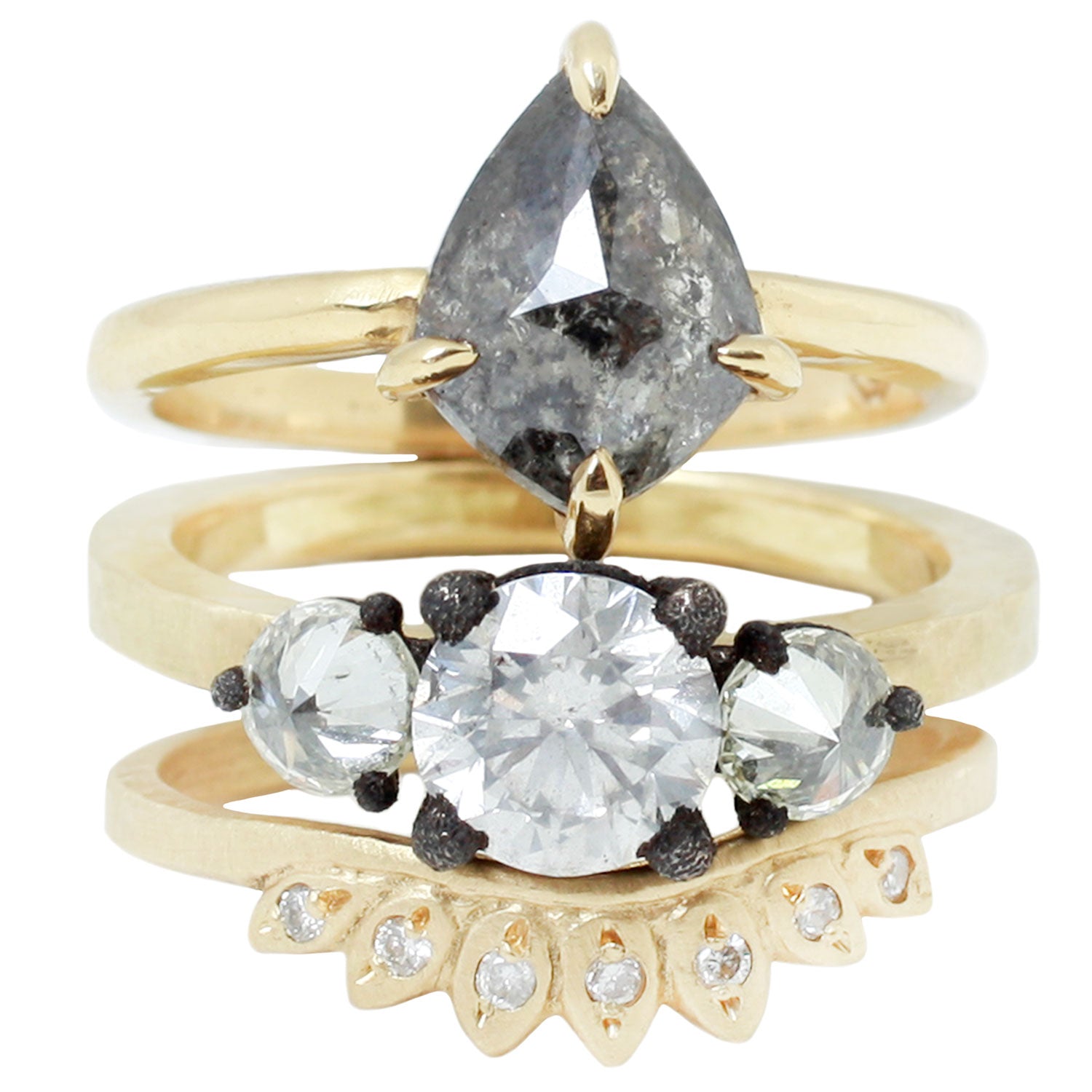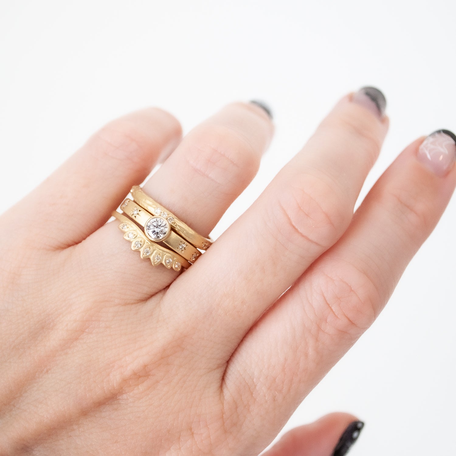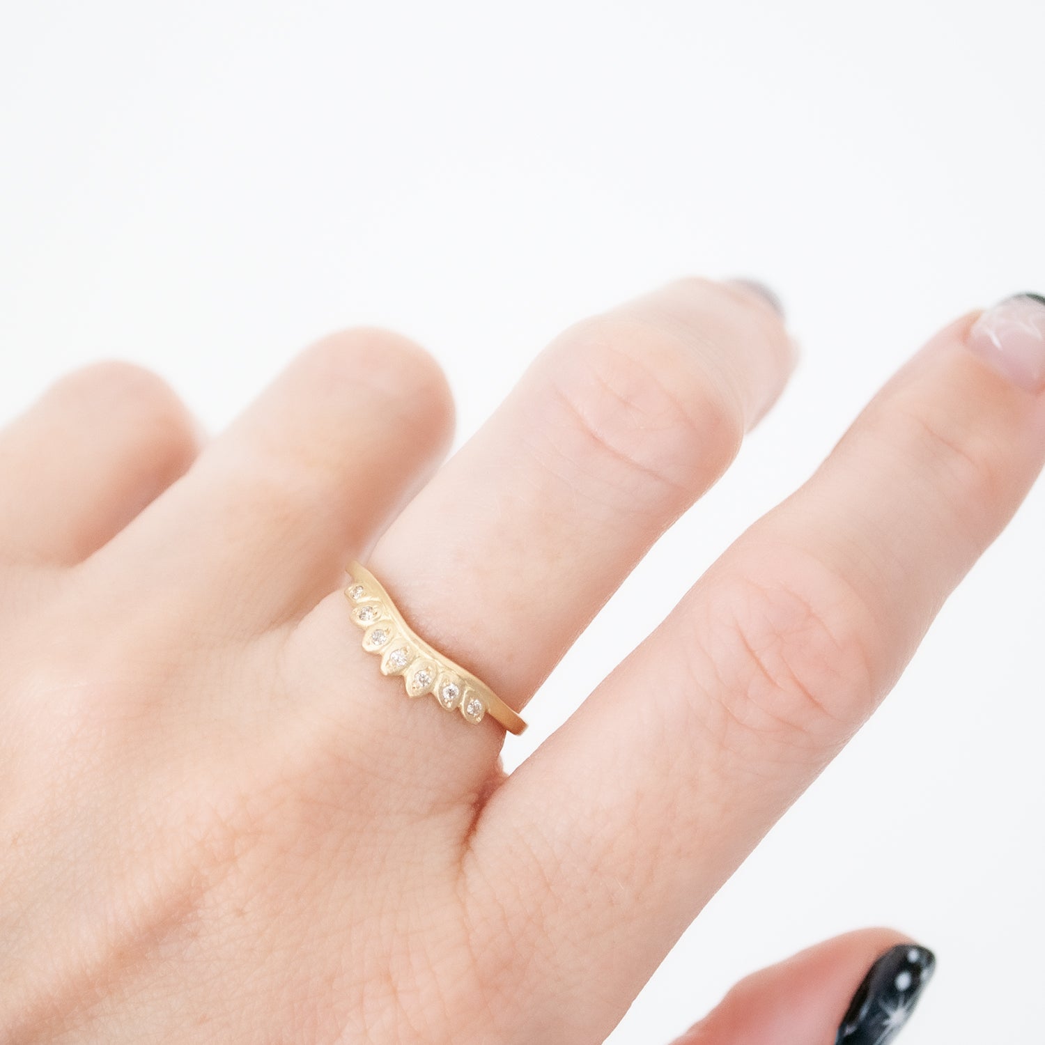 A row of laurel leaves line this warm gold ring by Sarah Swell. Each leaf holds a shining white diamond on this slightly rounded nesting band.