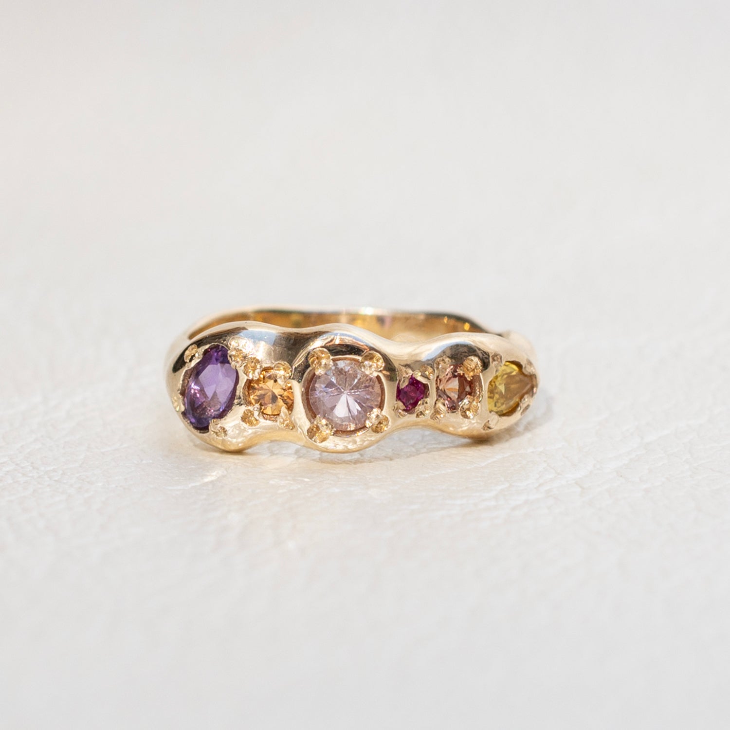 Like a vibrant sunset on a clear night, this one of a kind Susannah King ring features a range of beautiful shades. Multiple warm-toned sapphires and amethyst are set in shining, glossy gold. Each piece is a singular expression of sculptural design and chromatic intensity.