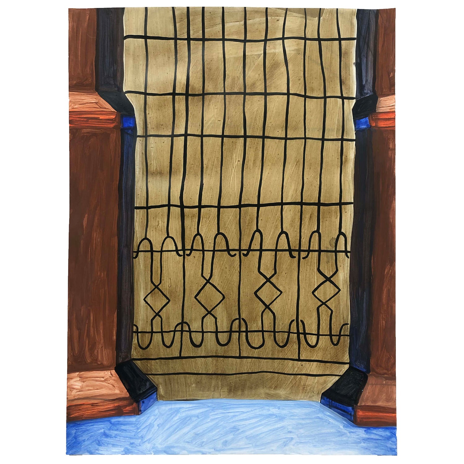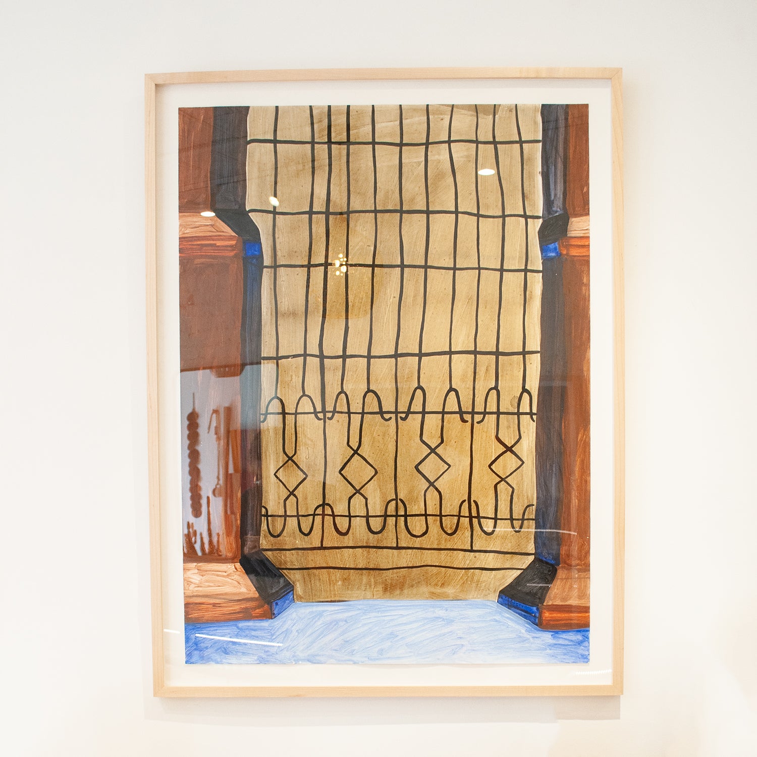 The Gate is an original framed artwork on paper by London-based artist Sophie Lourdes Knight. Sophie uses acrylics and a variety of tools to build a narrative arc with each of her paintings. Isolated space exudes expectant energy and her loose objects and characters depict themes of familiarity, sentiment, and the bizarre.