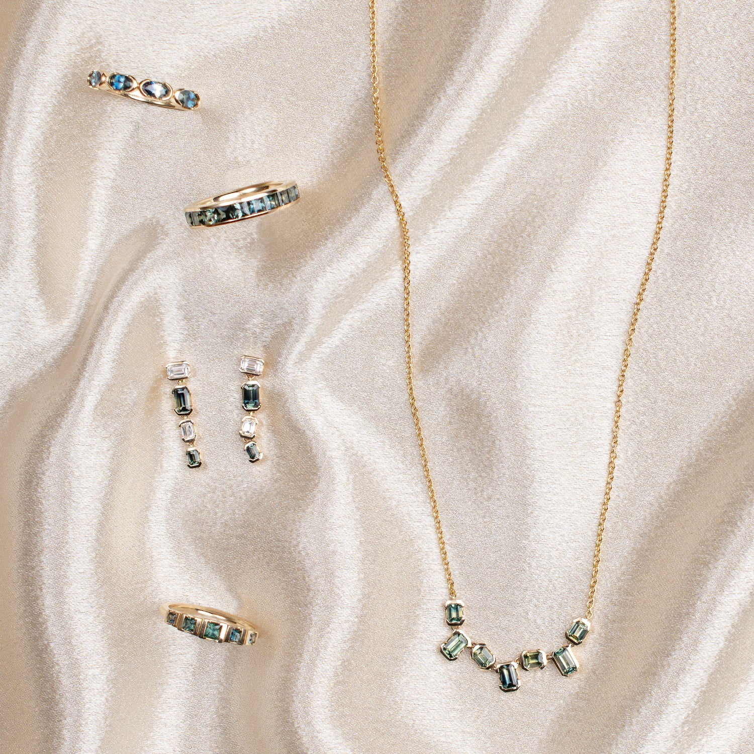 Mixing blue, yellow and green, these bi-color Australian sapphires are stunning. This seven-stone necklace by Rebecca Overmann features the designer's signature half bezel setting. The lattice-like pattern and color of the stones adds to the uniqueness of the piece.
