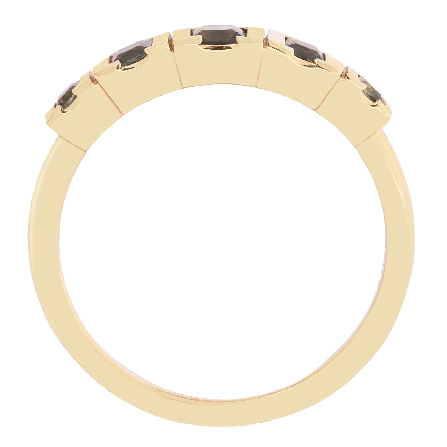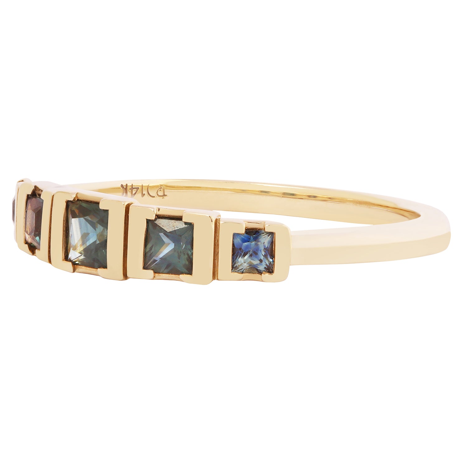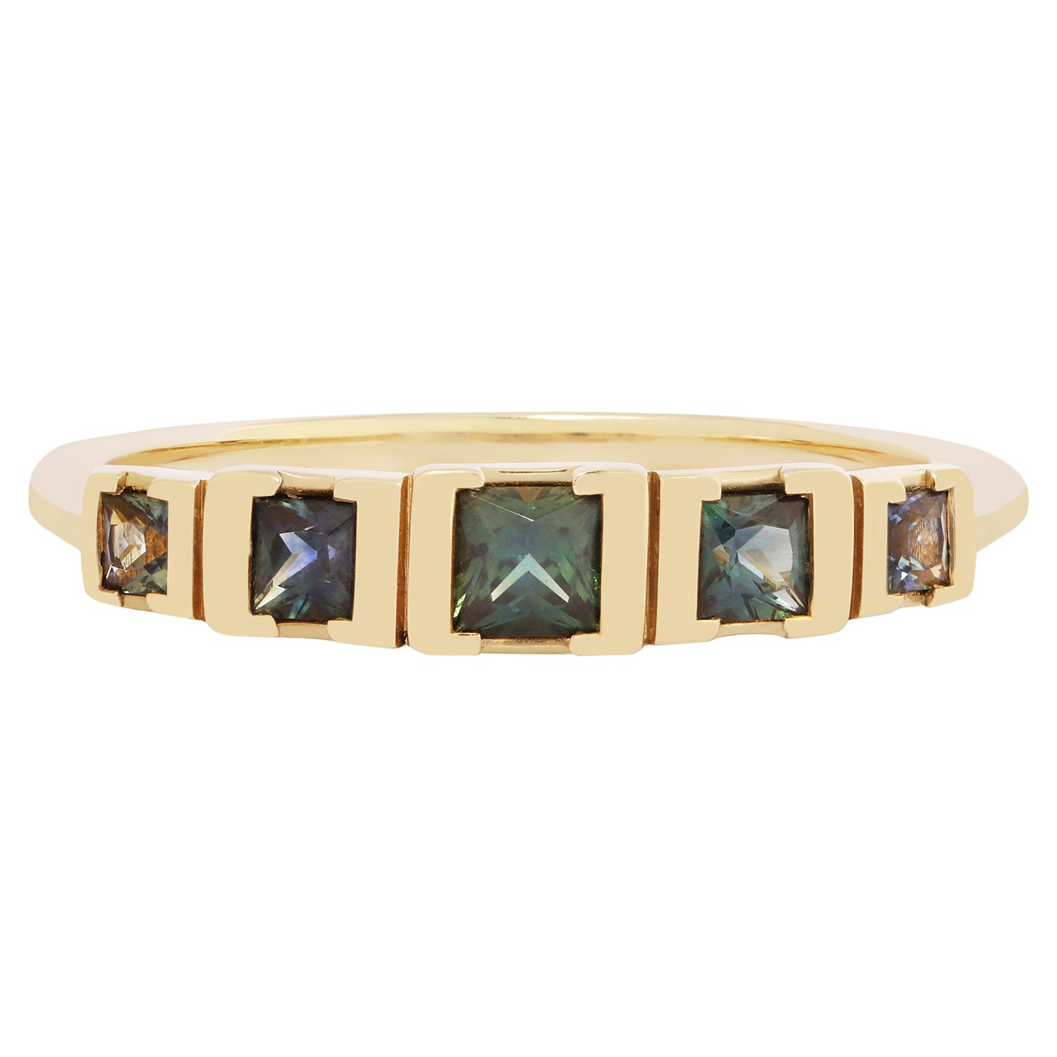 Bright, polished gold surrounds cool color-changing tones in this ring by Rebecca Overmann. Five princess cut Australian sapphires in shades of blue and green are elegantly featured on this sleek, tapered band.