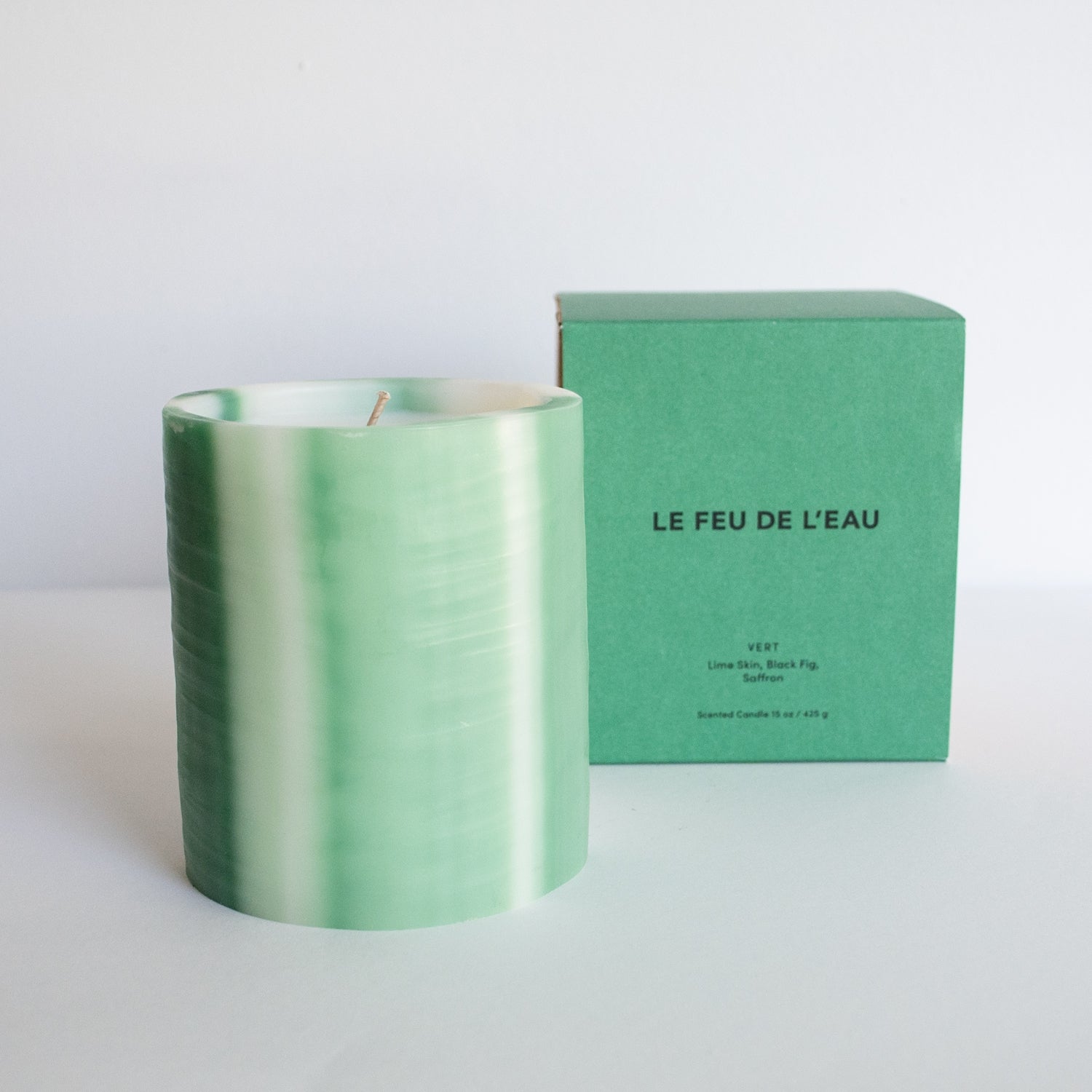 Handcrafted through an innovative underwater wax-sculpting technique, the Vert Candle represents Le Feu De L'Eau's commitment to artisanal excellence. Every piece is individually created—from custom color formulation and fragrance blending to meticulous hand-pouring of premium coconut-apricot wax. Poured in small batches in Los Angeles.