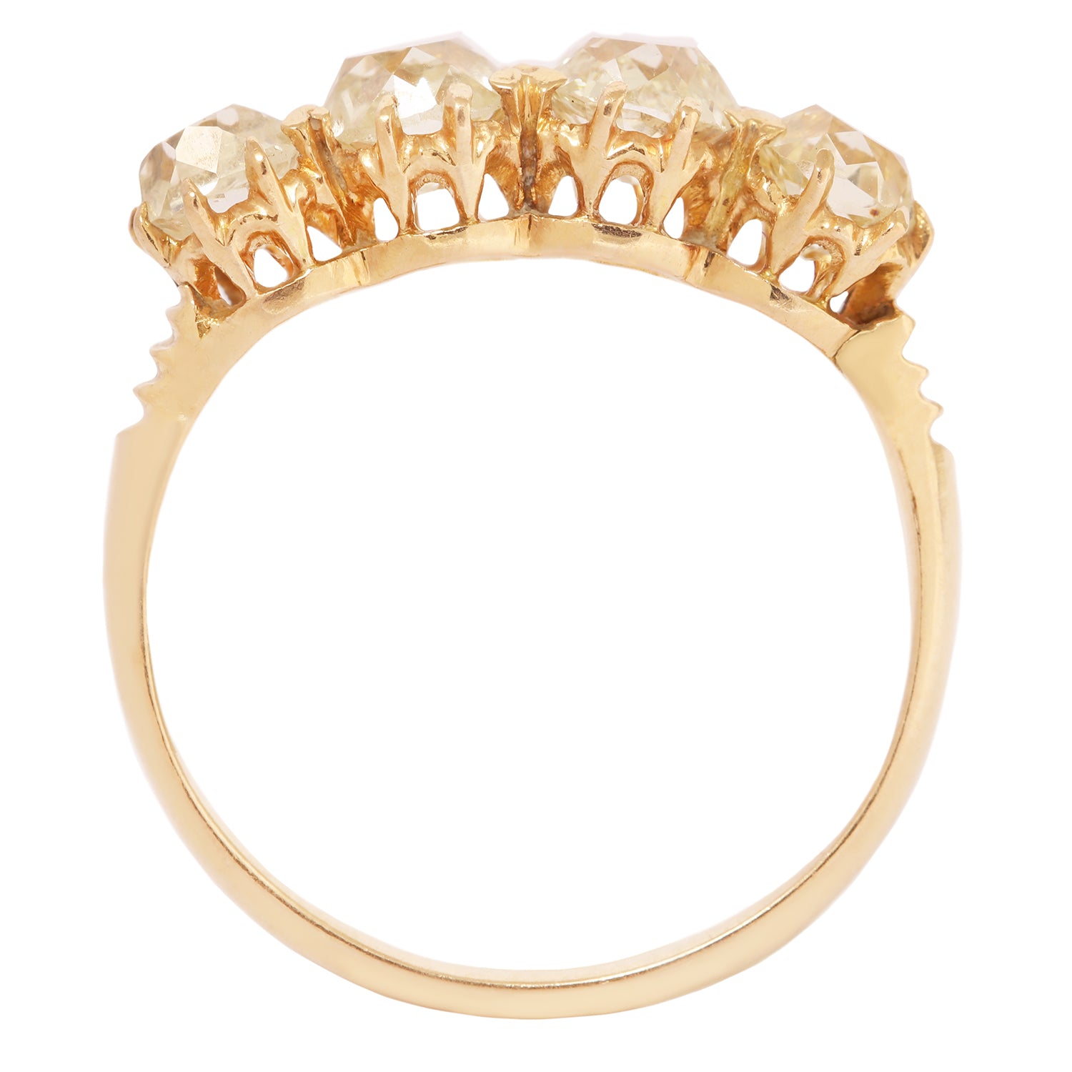 Four large, pillowy diamonds are elegantly set in shining gold. This antique ring, from 1880, is one of a kind and each of the four diamonds has a slightly cushiony, hand-cut shape typical of the period, with high crowns and open culets that give them a warm, flickering sparkle.