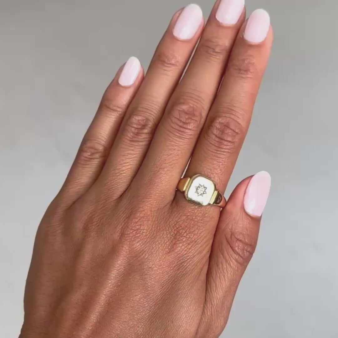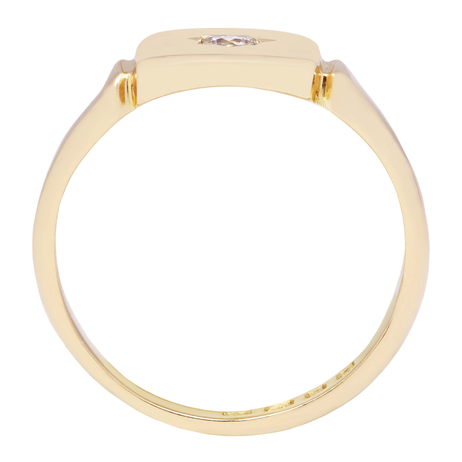 Glistening and solid, this antique signet ring has a single star set white diamond in the center. This timeless, classic piece hails from London, England, in 1939 and has its original hallmark stamps.