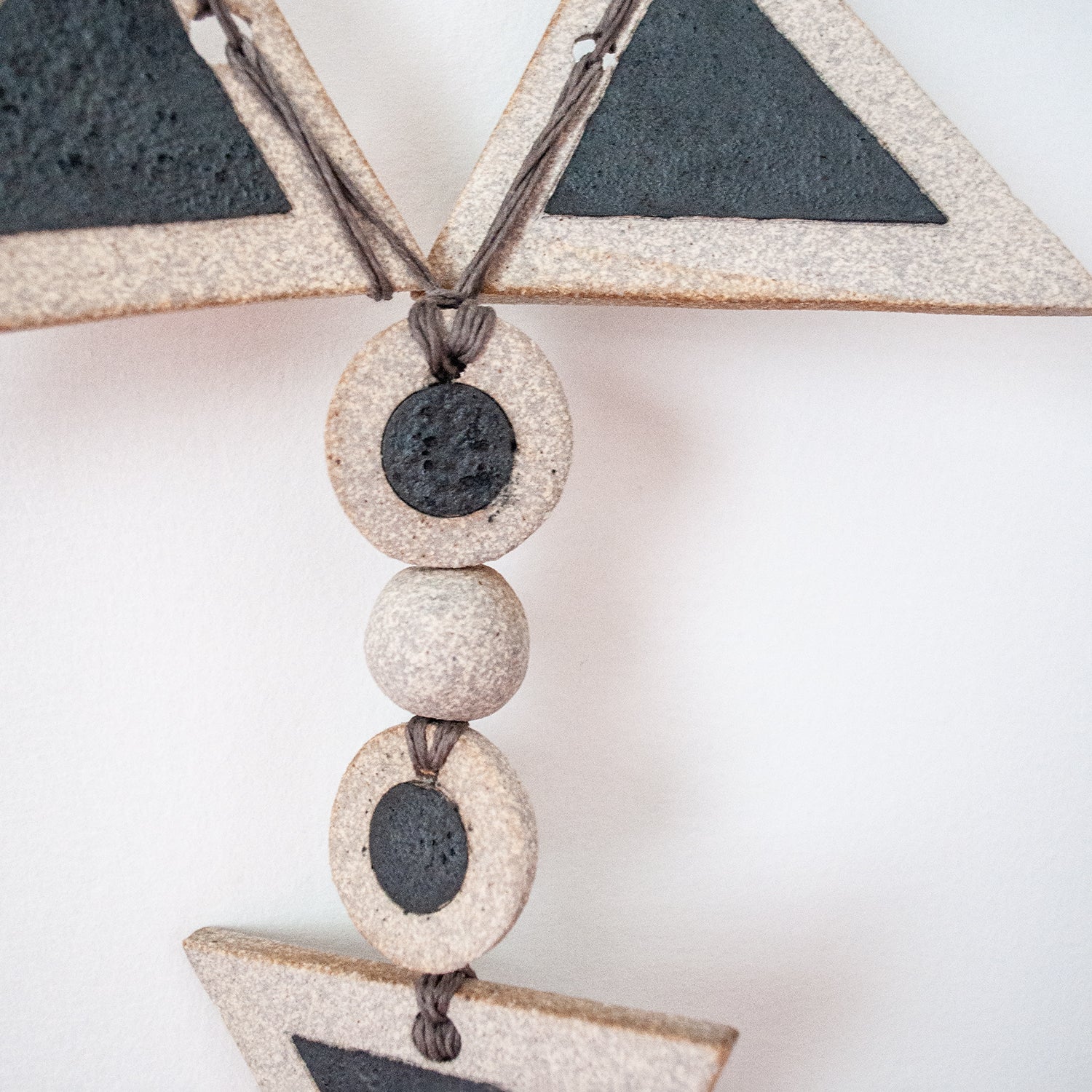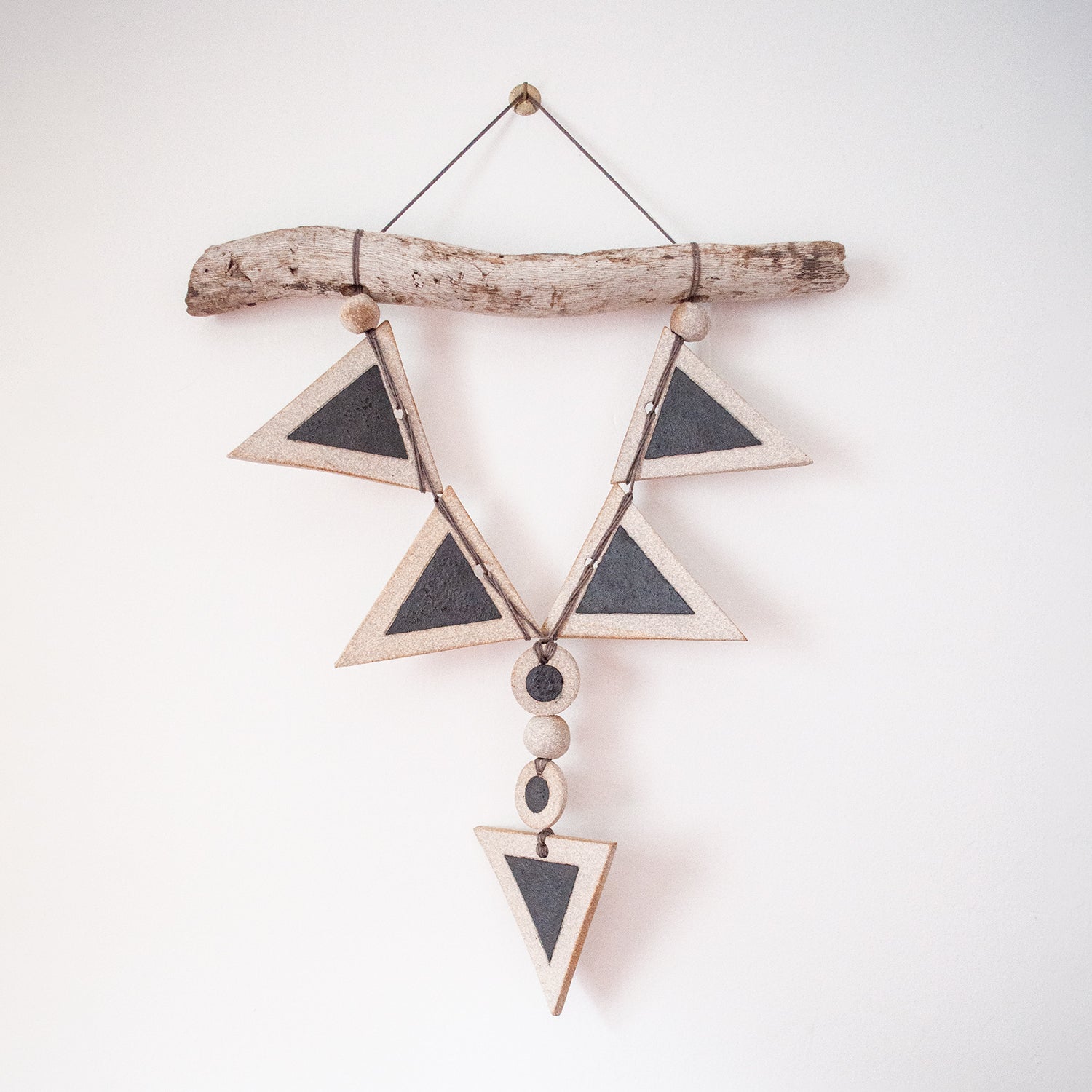 Inspired by the California landscape, Heather Levine uses natural driftwood and ceramic stoneware to craft her one of a kind wall hangings. The display of black triangular shapes brings the depth and symmetry of nature into your space.