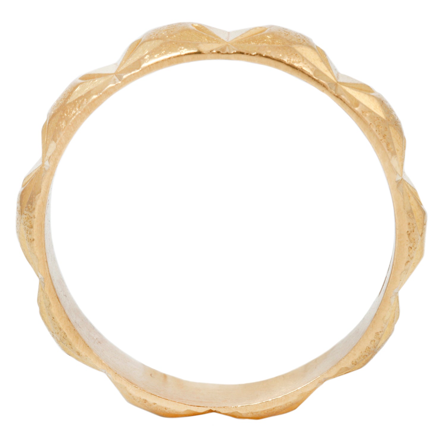 This heavy gold band was made in Birmingham, England c. 1972. It has a sparkly and unique pattern that goes all the way around the ring. This band cannot be resized due to its faceted pattern.