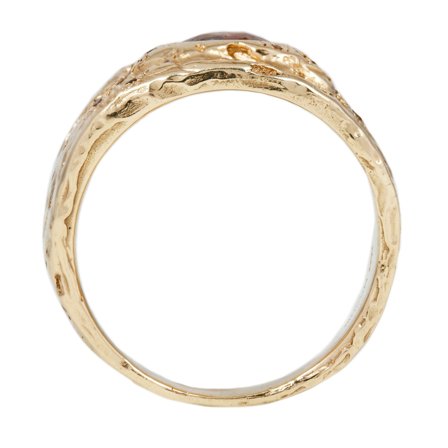 Paths of richly colored diamonds trail organically in textured gold with a stunning deep reddish brown rose cut diamond reigning supreme in the center. This treasure-like shield ring was inspired by unearthed medieval jewelry found in Scotland. Stunning as an alternative engagement ring, this Ellis Mhairi Cameron original also makes a beautiful statement stacked with more rings.